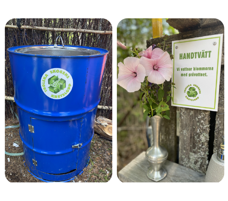 I vår ambition att bli ett så lokalt kretslopp som möjligt komposterar vi alla matrester som blir till jord för nya växter. Vid dassen finns speciella tvättställ med biologiskt nedbrytbar tvål så att vi kan återvinna vattnet och vattna skogens icke ätbara växter med det.